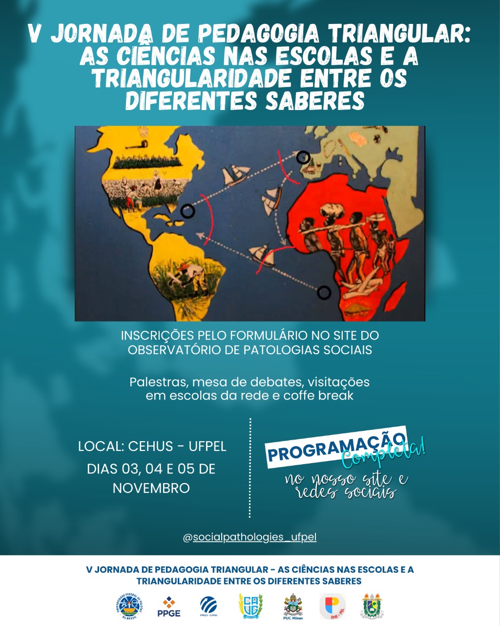 O Instituto Federal Sul-rio-grandense – Campus Pelotas Visconde da Graça (CaVG) participará da V Jornada de Pedagogia Triangular, promovida pelo Observatório Global de Patologias Sociais da UFPel, que acontecerá nos dias 3, 4 e 5 de novembro de 2025, no CEHUS, em Pelotas. Representando o campus, a professora Fernanda Carvalho e o professor Márcio Mariot integram a equipe de coordenação do evento.